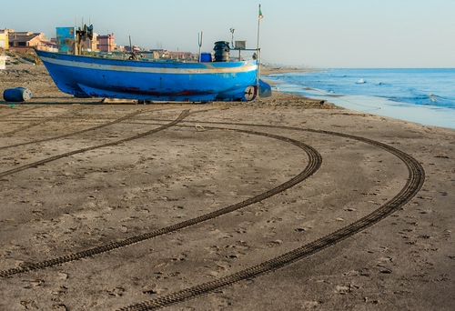Tag: mare, barca, spiaggia, sabbia, blu, impronte, orme, riva, curve, acqua, tracce, cielo.