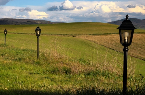 Tag: lampioni, nuvole, campi, erba, verde, tre, prato, prati, cielo, campagna.
